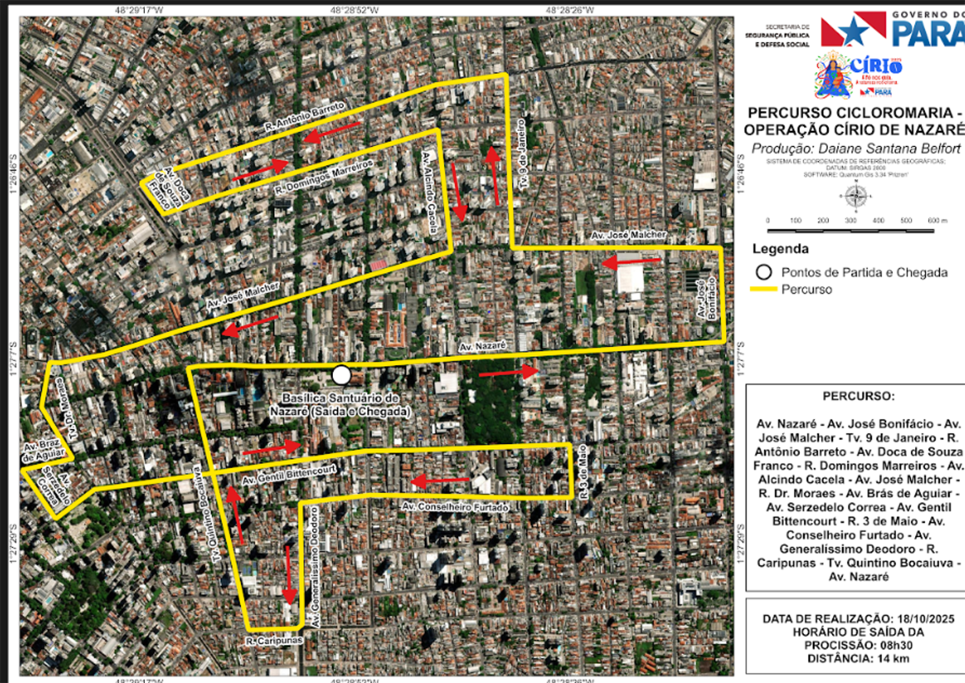 Percurso da Ciclo Romaria: Praça Santuário, avenida Nazaré, avenida José Bonifácio, avenida José Malcher, travessa 9 de Janeiro, travessa Antônio Barreto, Doca, Domingos Marreiros, avenida Alcindo Cacela, avenida José Malcher, travessa Dr. Moraes, Braz de Aguiar, Serzedelo Corrêa, avenida Gentil Bittencourt, 3 de maio, avenida Conselheiro Furtado, avenida Generalíssimo Deodoro, Caripunas, Quintino Bocaiúva e retorno na Av. Nazaré, rumo à Praça Santuário.