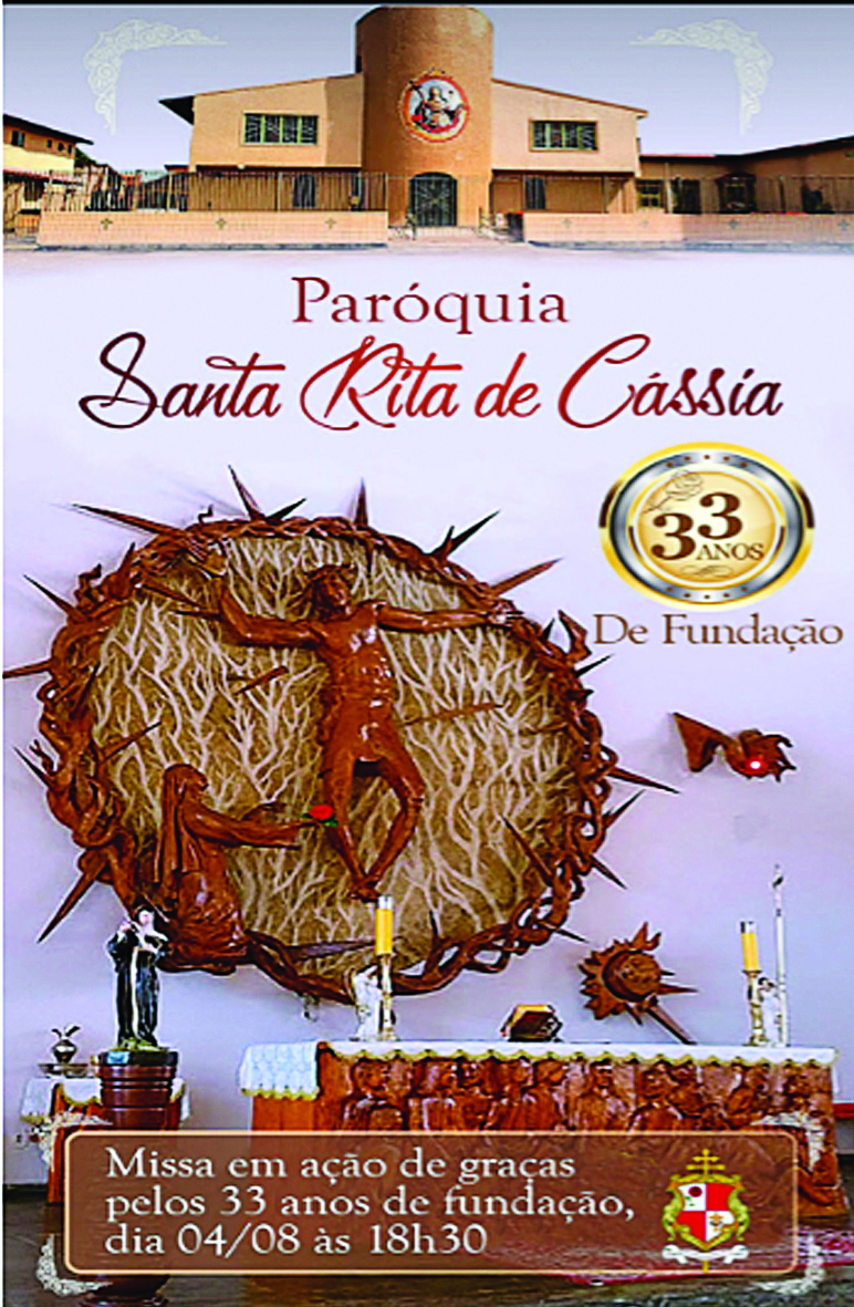 A Paróquia Santa Rita de Cássia foi fundada há 33 anos e no próximo dia 4, às 18h30, haverá Missa Solene em Ação de Graças pelo aniversário.