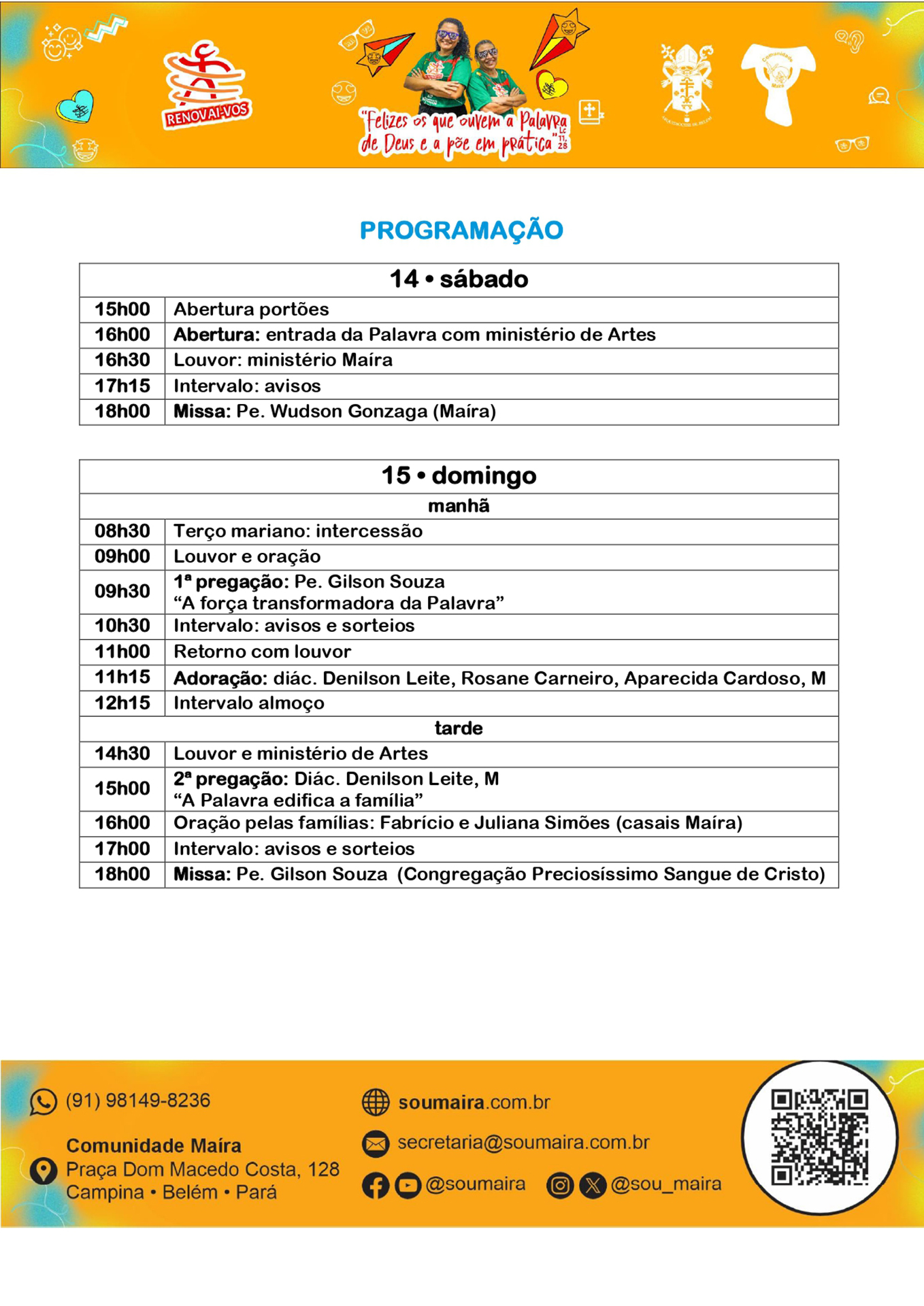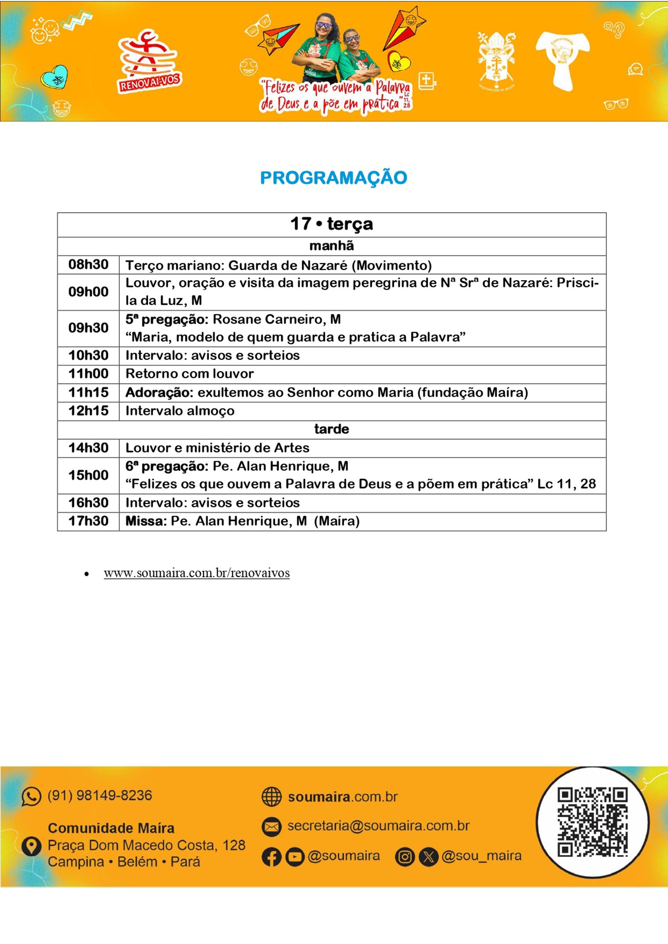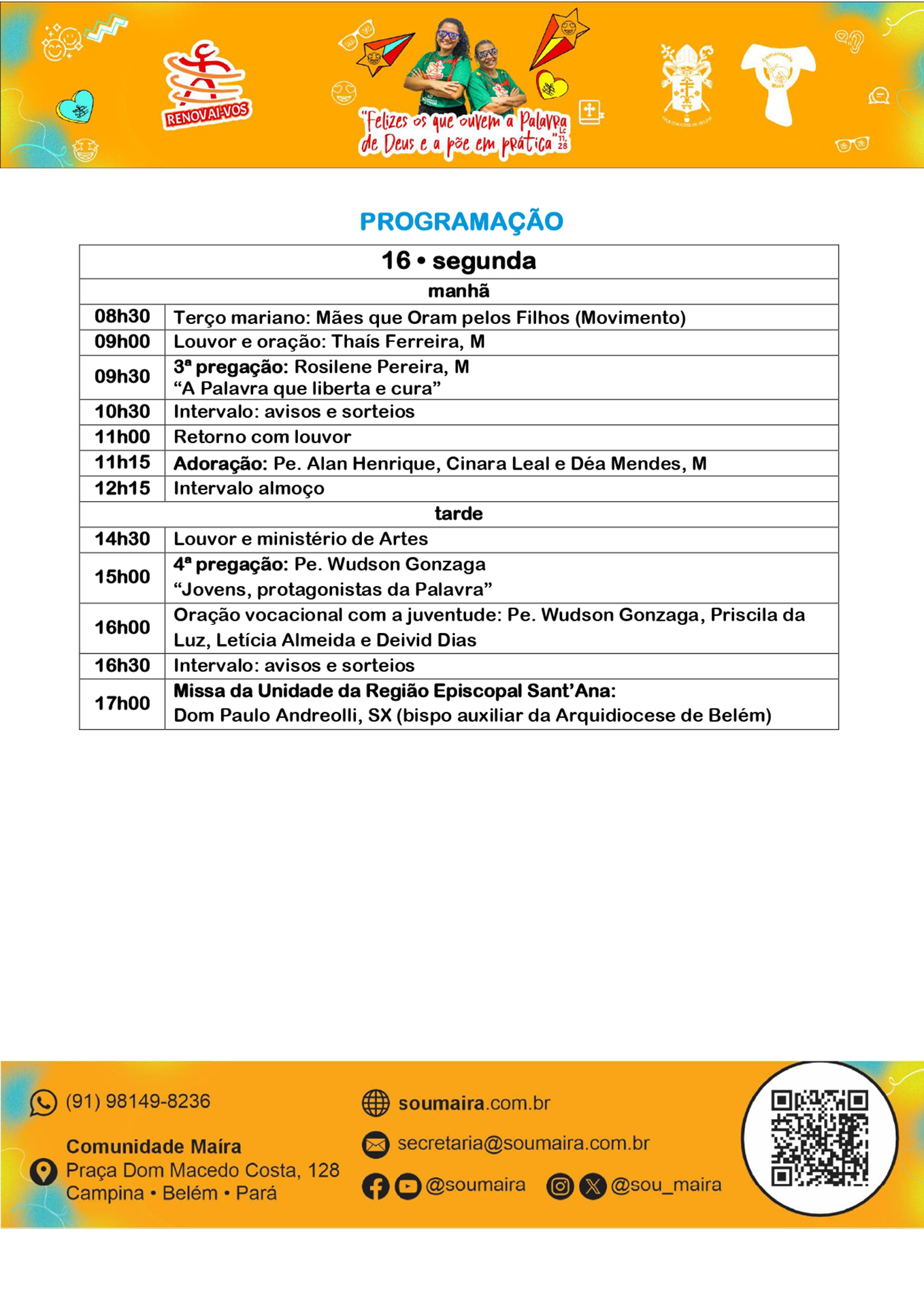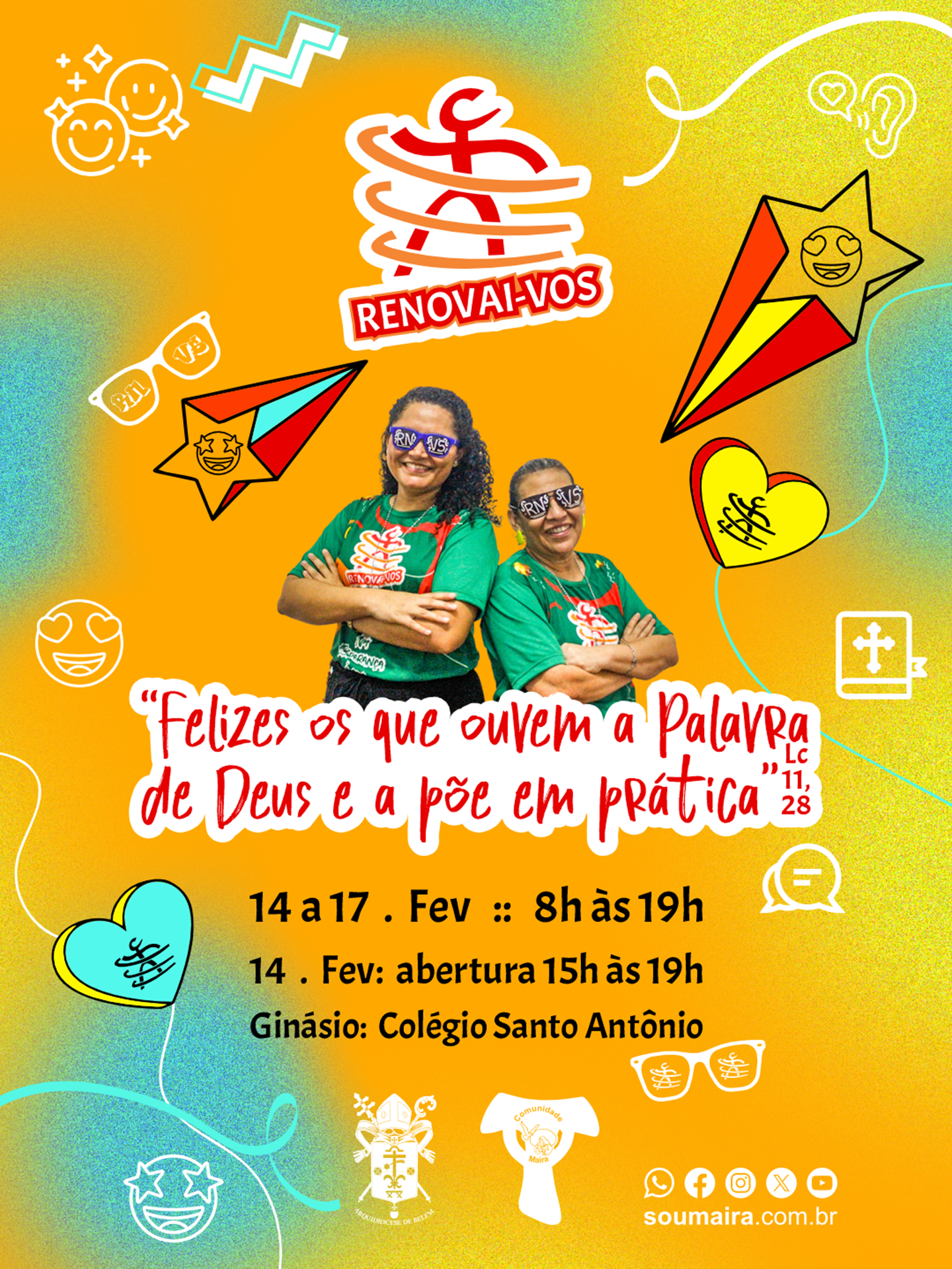 A Arquidiocese de Belém, sob organização da Comunidade Maíra, promove entre os dias 14 e 17 de fevereiro de 2026 a 36ª edição do Renovai-vos. O evento, considerado um dos retiros abertos tradicionais da capital paraense durante o período de carnaval, acontecerá no Ginásio do Colégio Santo Antônio, no bairro da Campina. A expectativa da organização é reunir entre 2 mil e 3 mil Católicos ao longo dos quatro dias de programação.