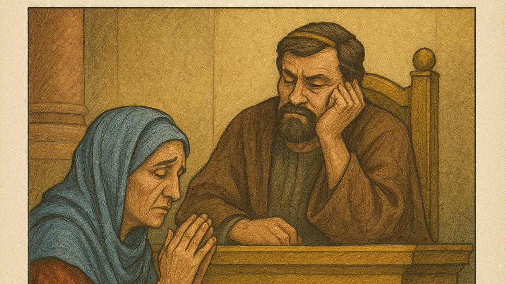 O Evangelho (Lc 18,1-8) apresenta a parábola de um juiz perverso, que não respeitava a ninguém, e ao ser desafiado insistentemente por uma simples viúva, vê-se obrigado a atender o seu pedido, ou seja, fazer-lhe justiça. Na verdade, não é o juiz em si que está em relevo nessa história, mas, sim, a perseverança daquela viúva em buscar justiça,insistentemente.