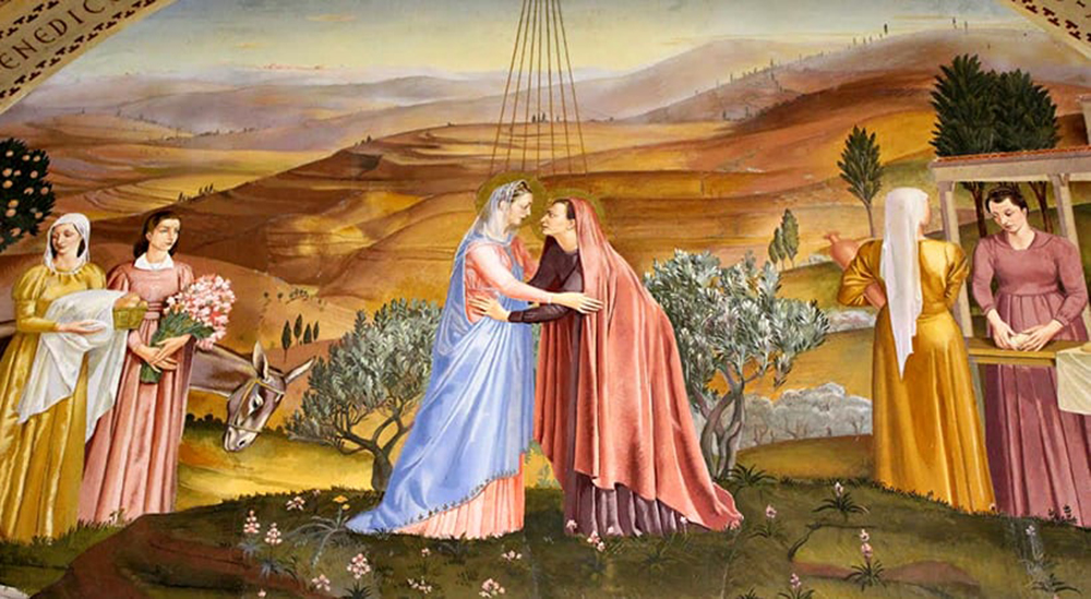 Quando se entra no santuário, parece que ainda escutamos a exclamação de Isabel em resposta à saudação de Maria, chamando-a de “Bendita entre as mulheres” e ao Filho que traz no ventre de “Bendito o fruto do teu ventre”. Não há dúvida de que a cena é messiânica, mas Maria é a Mãe do Messias, então diz respeito a ela também. A alegria que enche a casa de Isabel e Zacarias é a alegria trazida pelo Messias que Maria traz no ventre. Dentro do templo em AinKarim, brilha a figura de Isabel “repleta do Espírito Santo”, falando como uma profetisa, clamando com voz forte, olhando para Maria, extasiada, proclamando: “Bendita és tu entre as mulheres e bendito o fruto de teu ventre”. Nas palavras de Isabel, ecoam as bênçãos prometidas por Deus no livro do Deuteronômio (28,4), que agora se cumprem, definitivamente; ecoa o cântico de Débora louvando Jael, após a vitória em uma memorável batalha, no qual esta juíza diz: “Bendita entre as mulheres Jael seja” (Jz 5,24). Um medalhão na Basílica de Nazaré homenageia Jael, entre outras mulheres ilustres. Nestas palavras de Isabel, há um superlativo que não se pode relevar: De todas as mulheres, das mais louváveis e importantes, ilustres e nobres de todos os tempos e eras, Maria é a mais importante porque foi a ela que o Senhor Deus Criador de todas as coisas se dirigiu e lhe mudou o nome, chamando-a de “Cheia de graça”, por este fato inusitado e único: Maria foi escolhida para ser a Mãe do Filho de Deus.