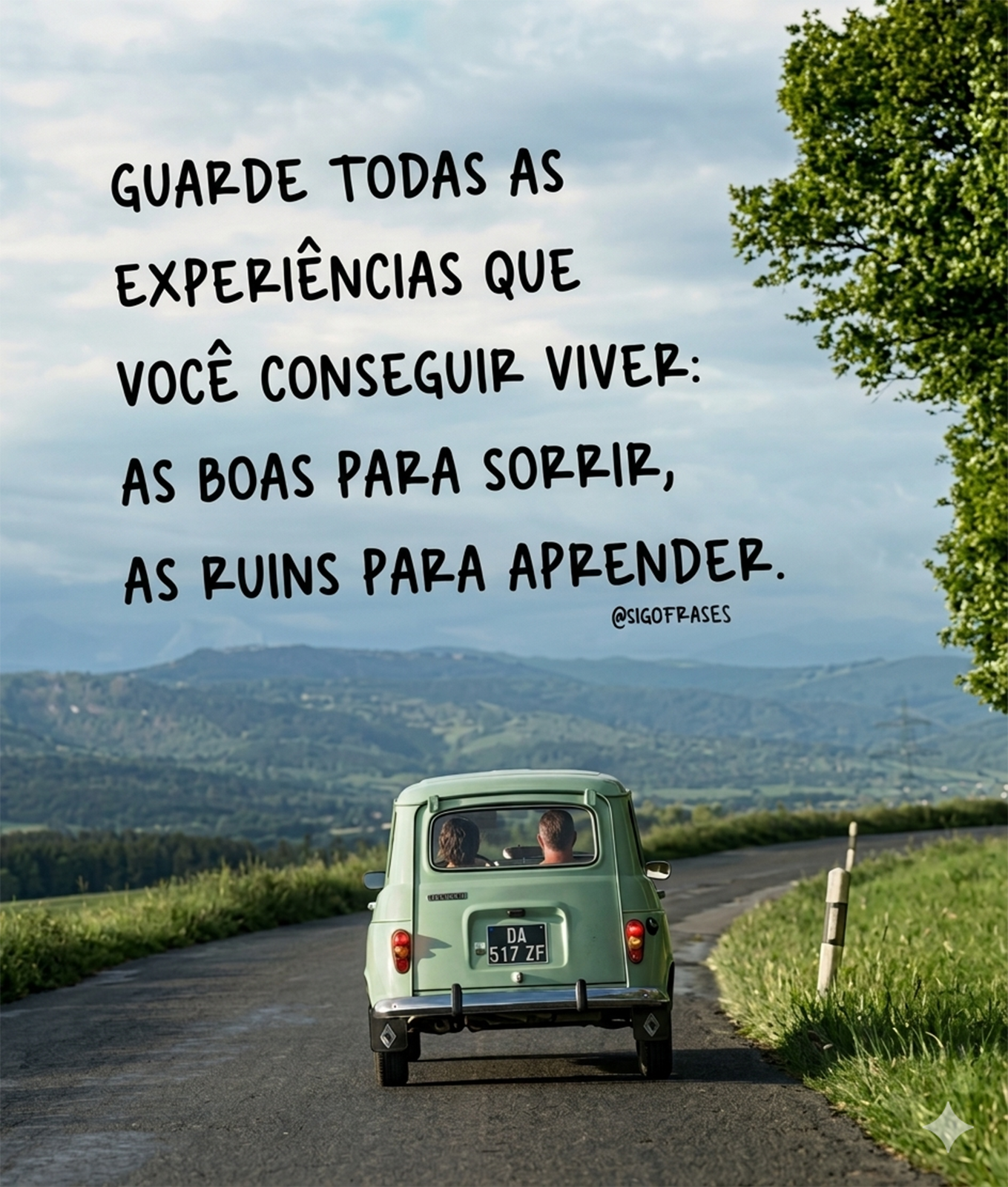 A legenda que acompanha a foto resume essa sabedoria profunda: “Guarde todas as experiências que você conseguir viver: as boas para sorrir, as ruins para aprender.” Que verdade! Cada quilômetro percorrido carrega lições valiosas. As alegrias nos enchem de gratidão e nos motivam a prosseguir; os tropeços, as panes e os atrasos nos ensinam resiliência, paciência e humildade. Na fé cristã, isso ecoa as palavras de São Paulo: “Tudo concorre para o bem daqueles que amam a Deus”. Assim, transformamos o caminho em escola de vida, onde Deus nos molda dia a dia.