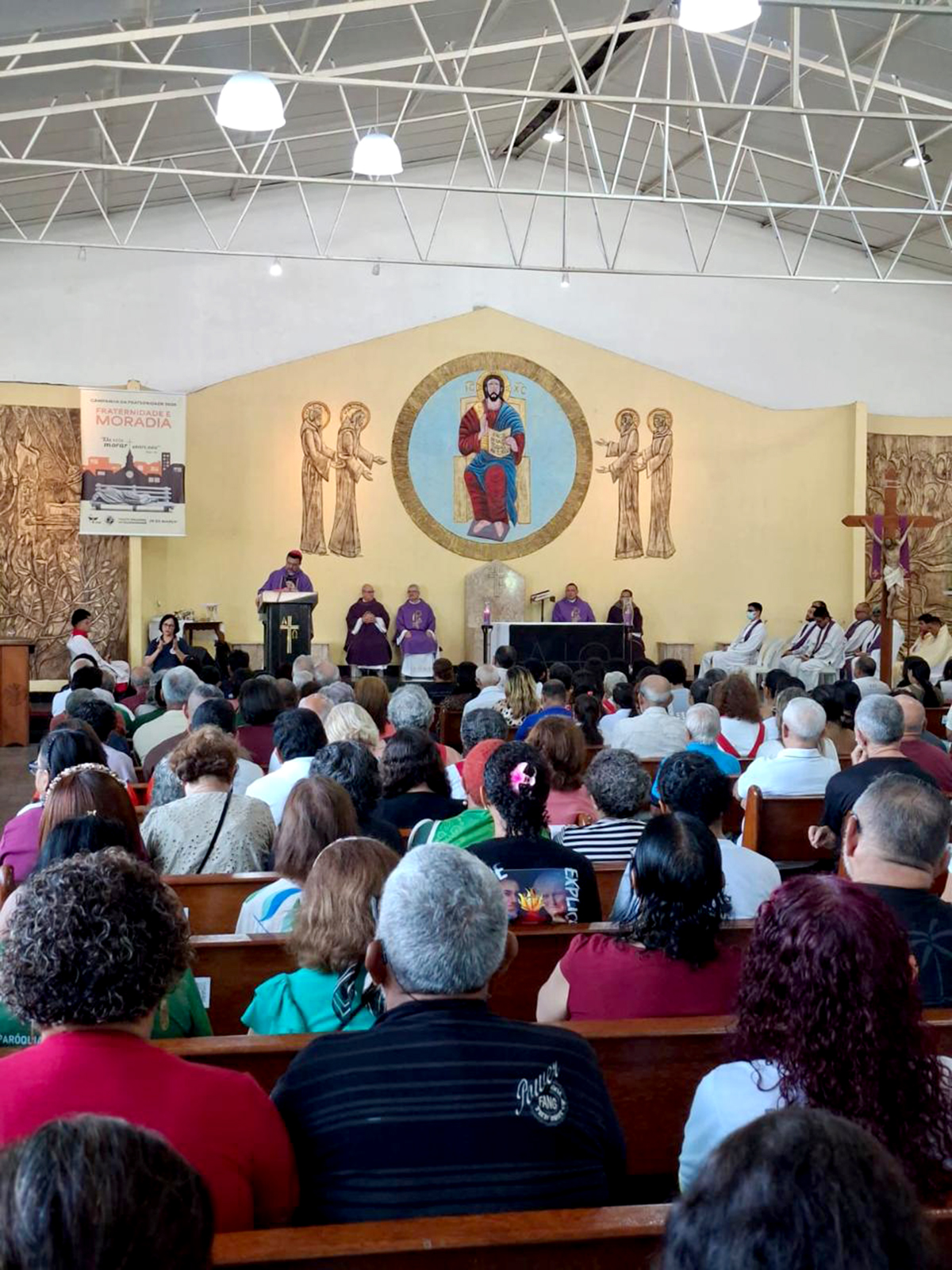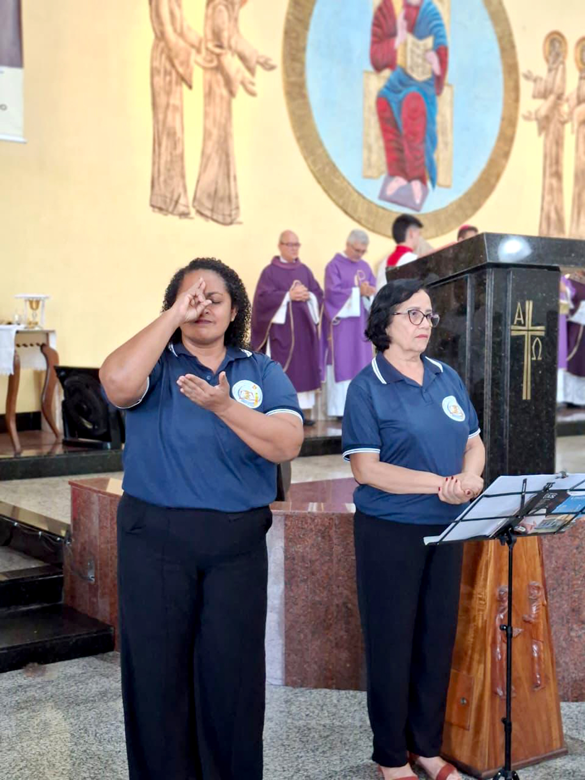 Durante a solene eucaristia, agentes da Pastoral do Surdo da Paróquia Rainha da Paz realizaram a interpretação em Libras, promovendo acessibilidade para os não-ouvintes presentes.