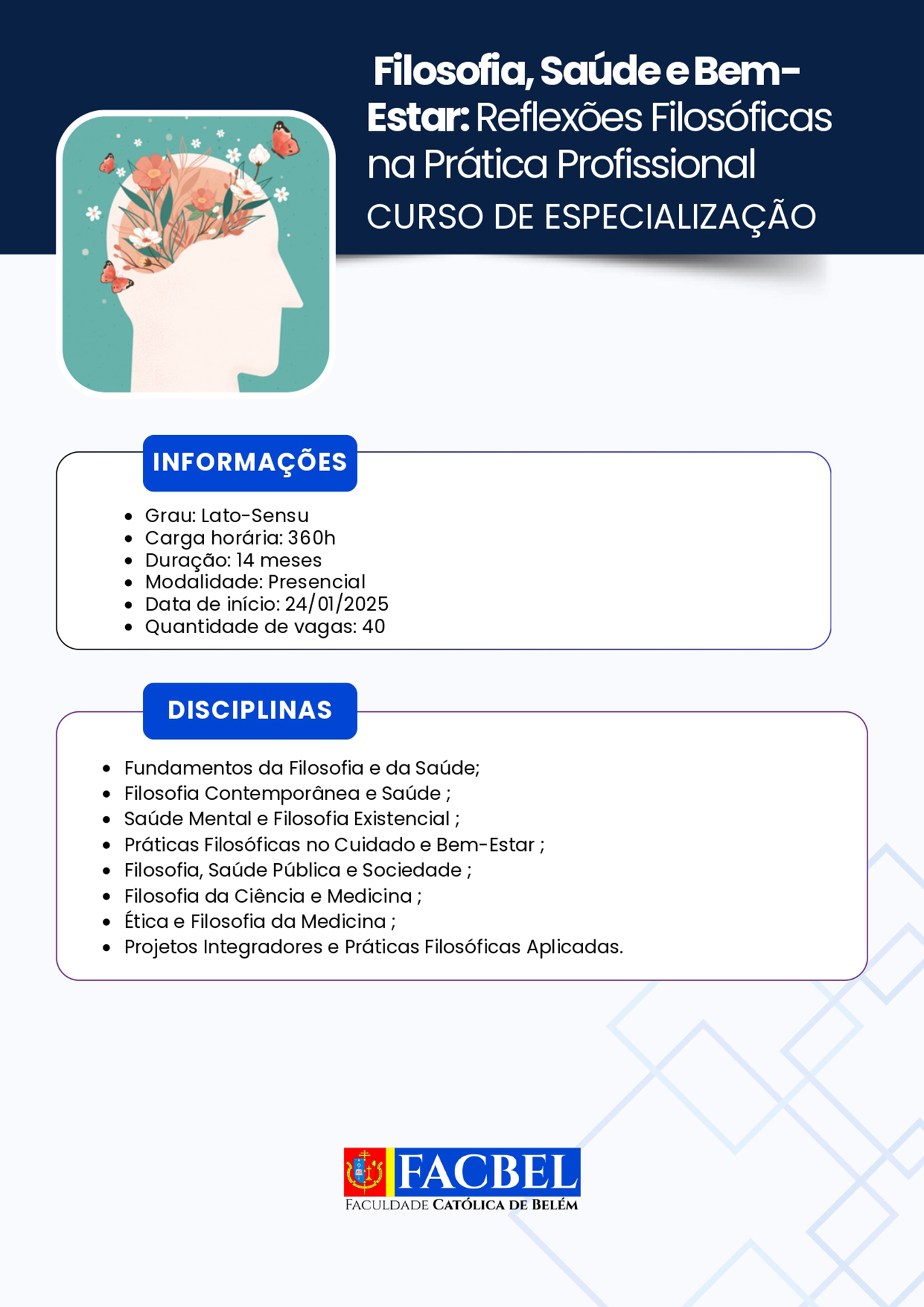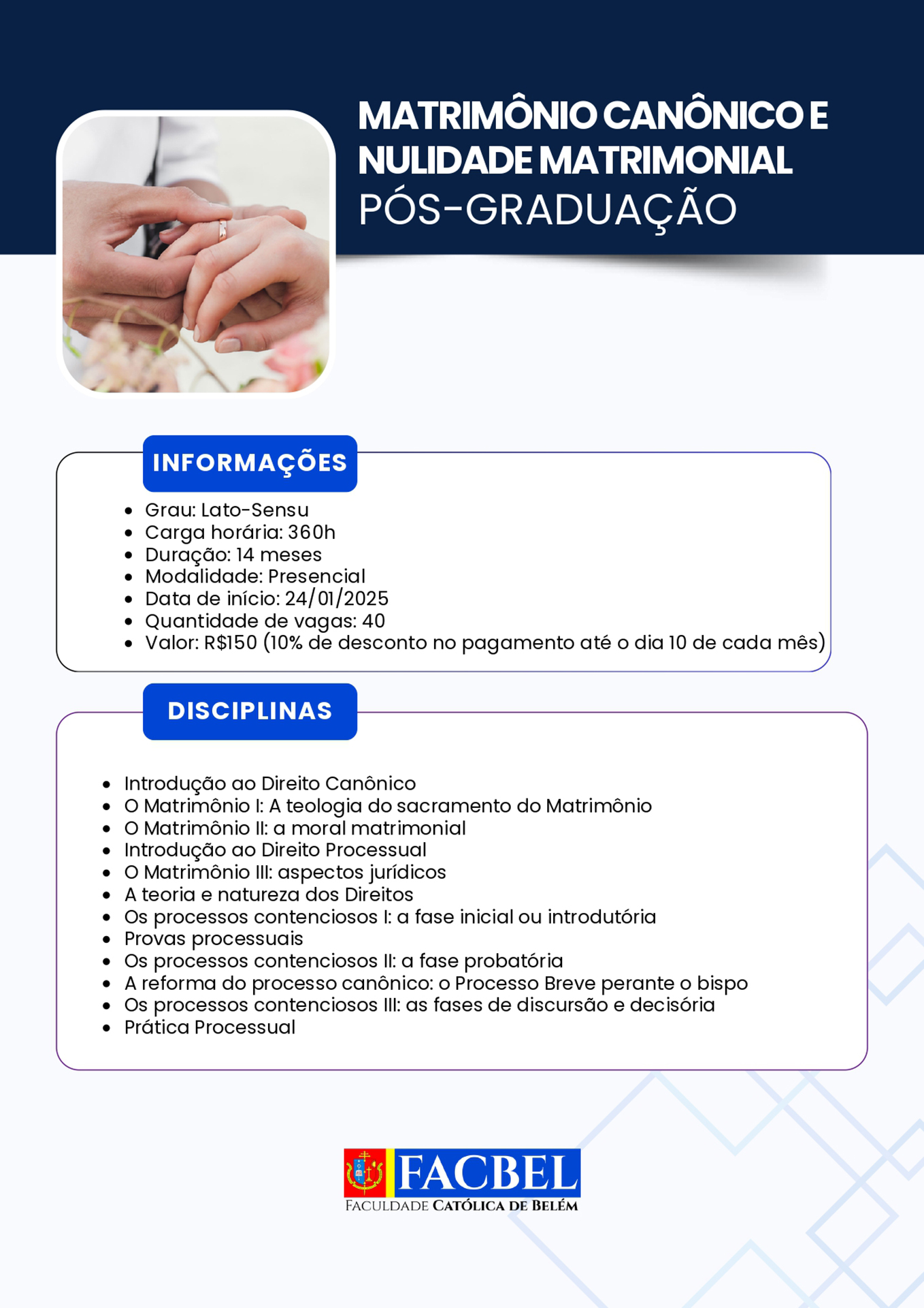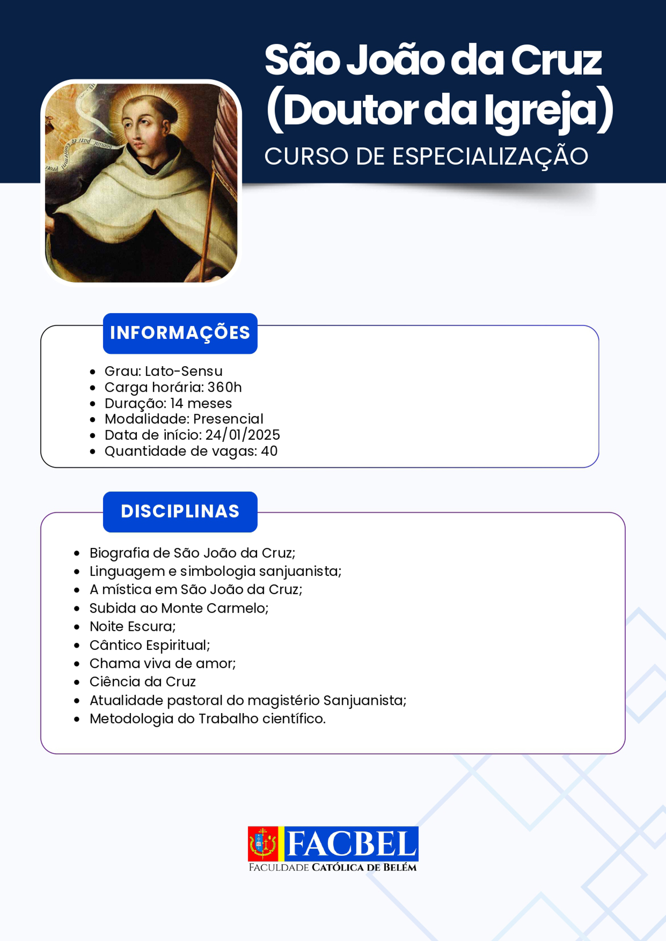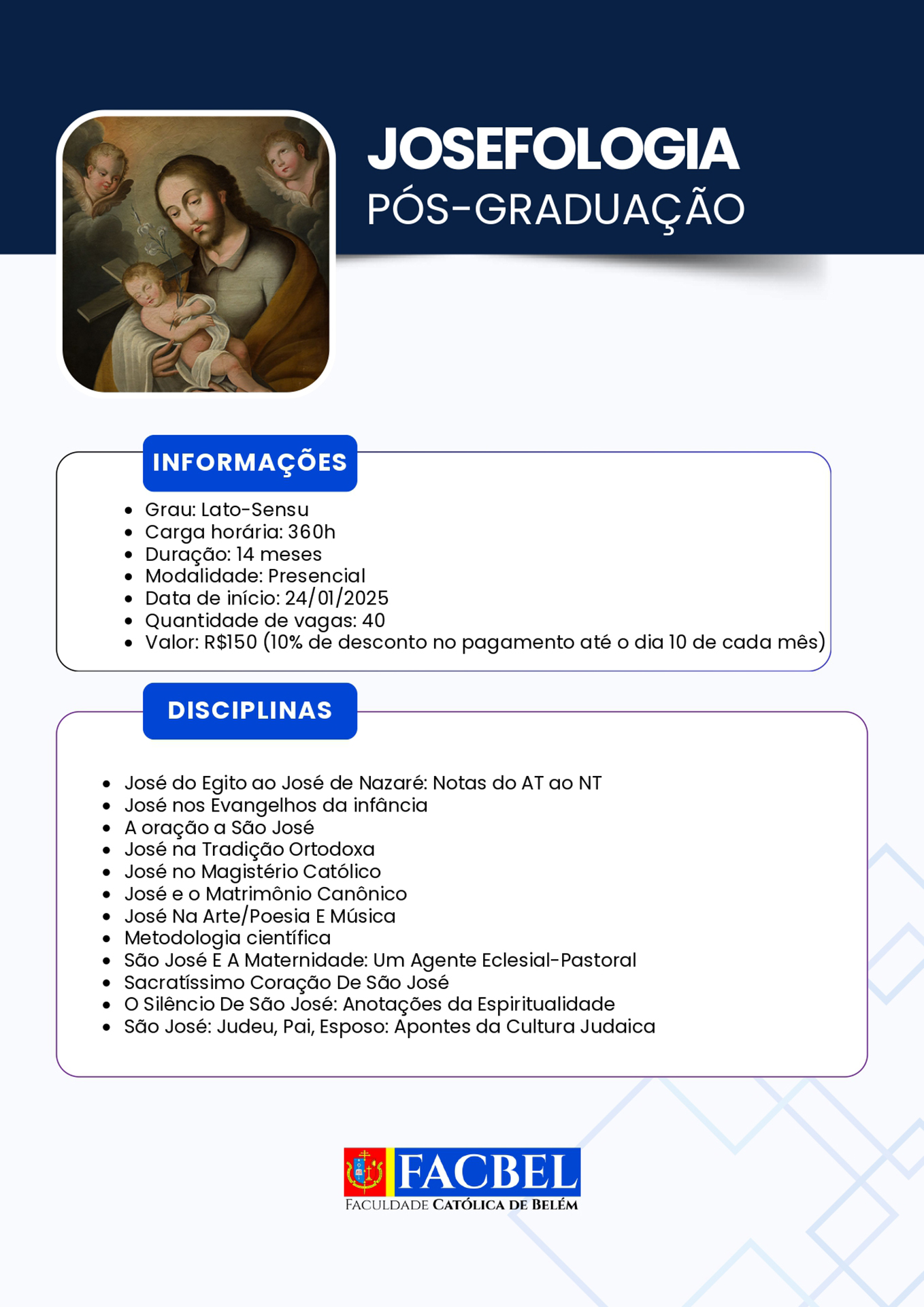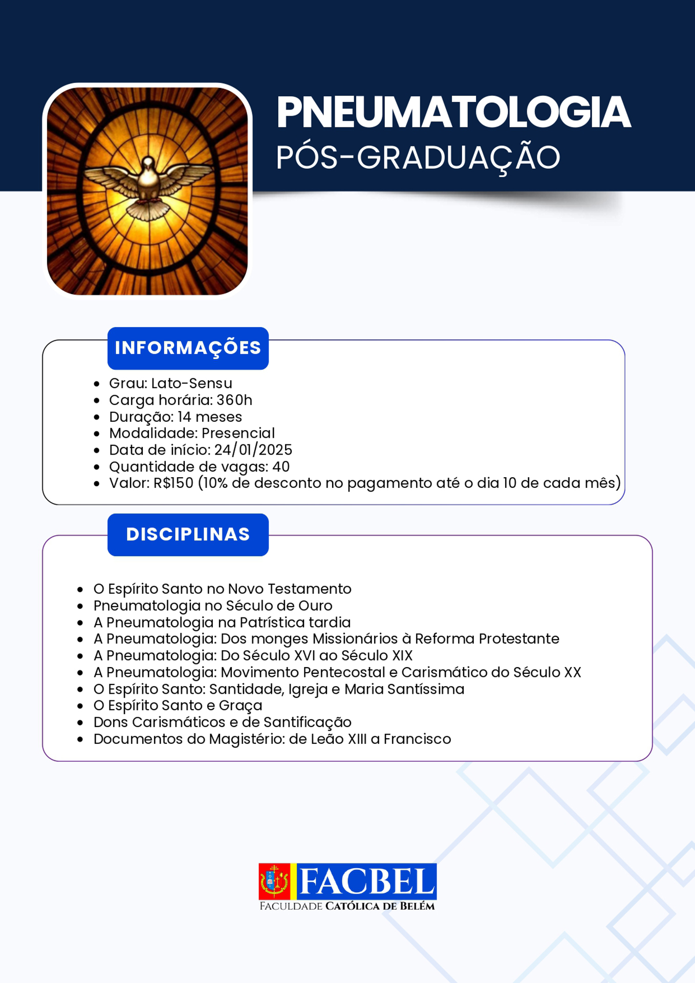 A Faculdade Católica de Belém (Facbel) está recomeçando suas atividades referentes ao ano letivo 2026. Uma boa oportunidade para os interessados habilitarem-se ao estudo de diversas opções de aprendizado acadêmico.