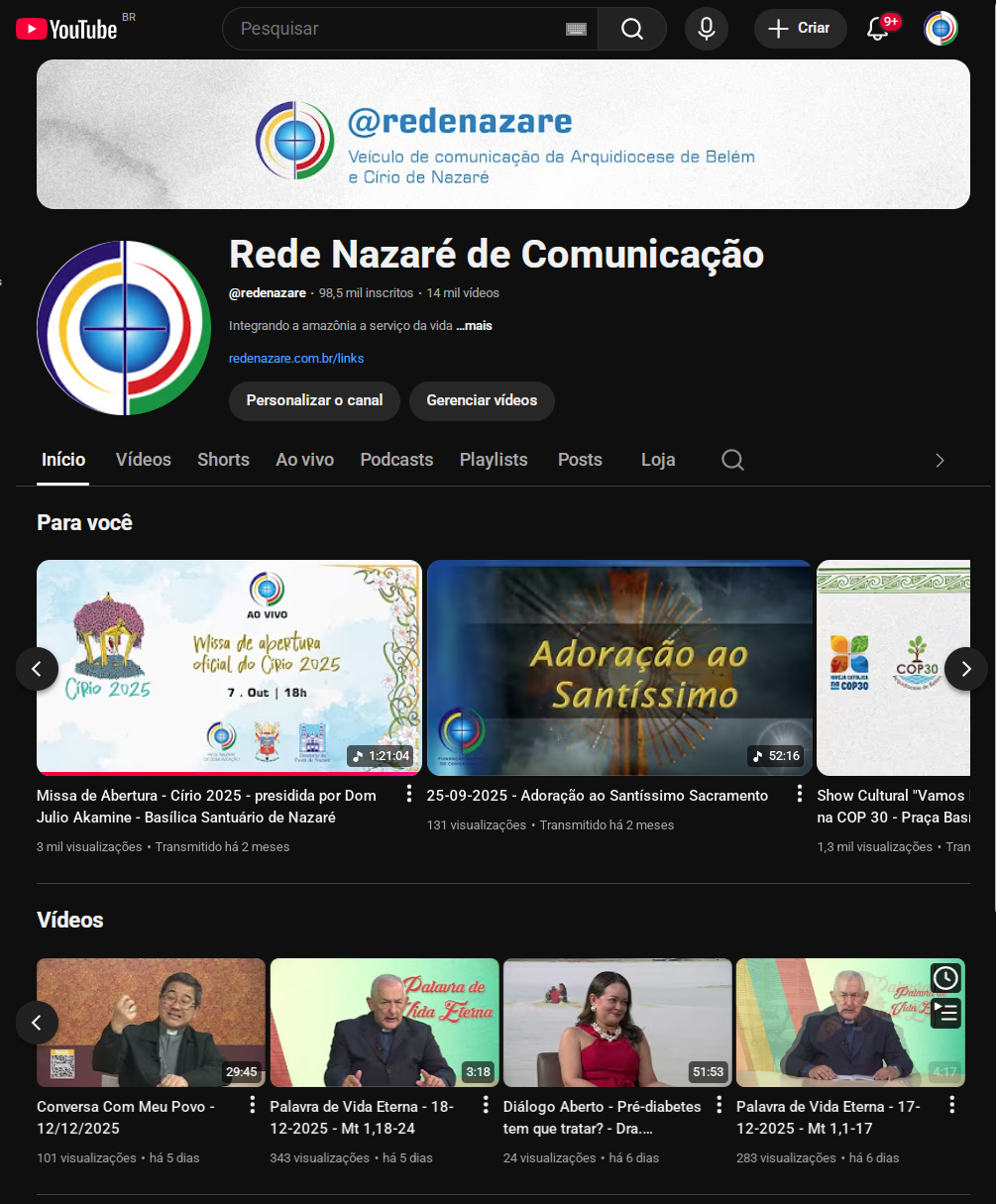 “Rumo aos 100 mil inscritos! – Falta pouco!! Sua ajuda tem sido fundamental para fazermos crescer a Rede Nazaré de Comunicação no Youtube: já somos 98.548 inscritos no canal. Você pode apoiar o nosso canal e fazer parte da nossa jornada. É só se inscrever rapidinho. Acesse @redenazare, clique no botão de inscrever-se! Conto com você!”, ressalta