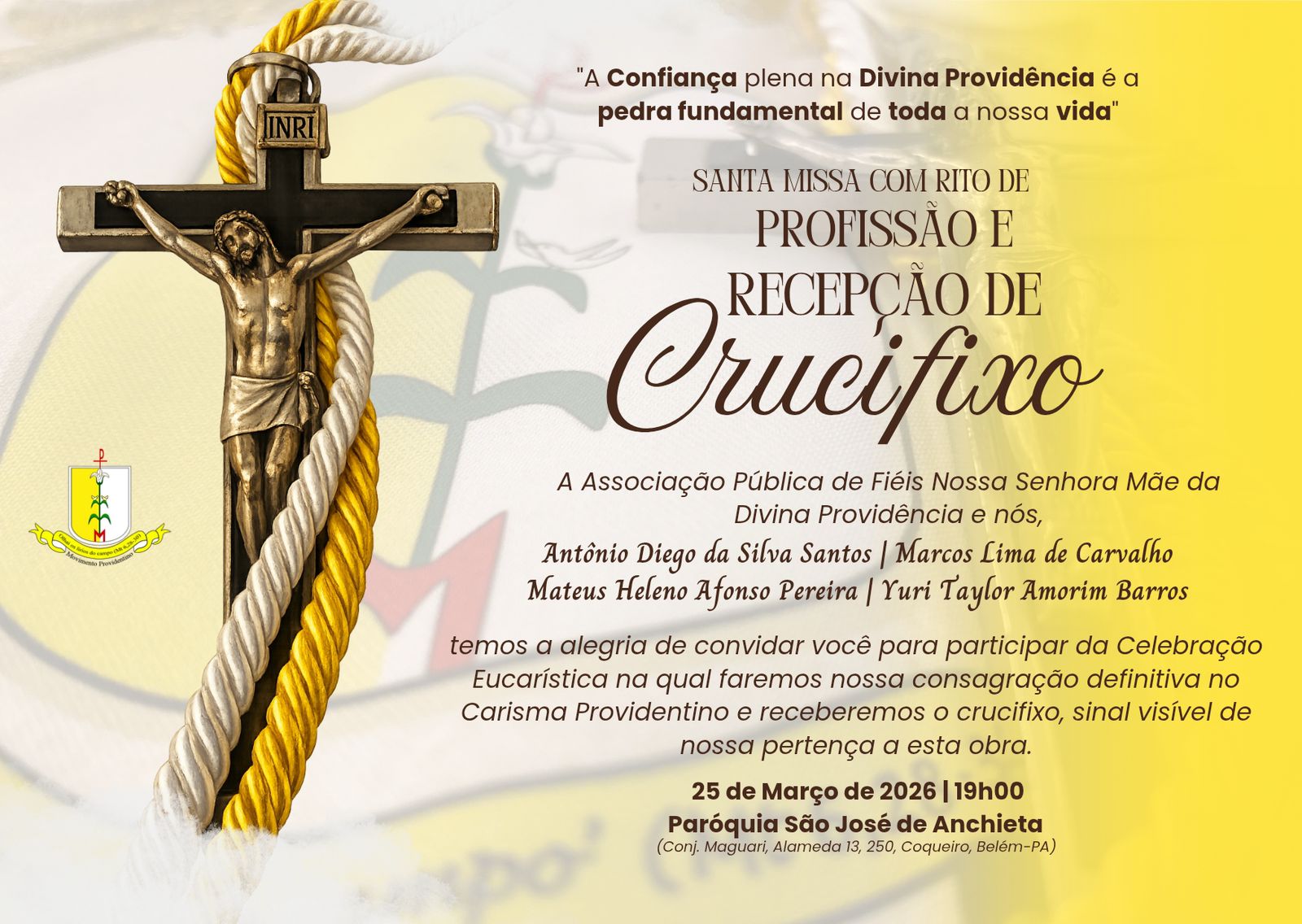 Nesse sentido, em espírito de gratidão e comunhão, o Movimento Providentino se prepara espiritualmente com o tríduo de São José, seu santo de devoção do carisma, missa de acolhida de cinco novos Iniciantes, dois novos Estagiários e renovação de sete membros. Maior alegria será com a Profissão de quatro membros, Antonio Diego, Marcos Carvalho, Mateus Heleno e Yuri Taylor. Este momento marca a consagração definitiva do Estagiário no carisma Providentino, de modo a pertencer perpetuamente à obra. A Santa missa será às 19h na Paróquia São José de Anchieta, no Conjunto Maguari, em Belém, e contará com a participação dos irmãos sacerdotes, leigos consagrados e diversas fraternidades que bebem dessa espiritualidade.