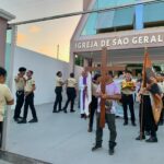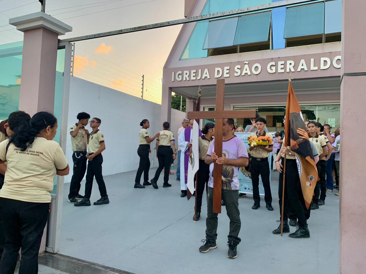 Durante o trajeto, os guardas conduziram a imagem de São Geraldo, acompanhados pela comunidade em um momento de oração.
