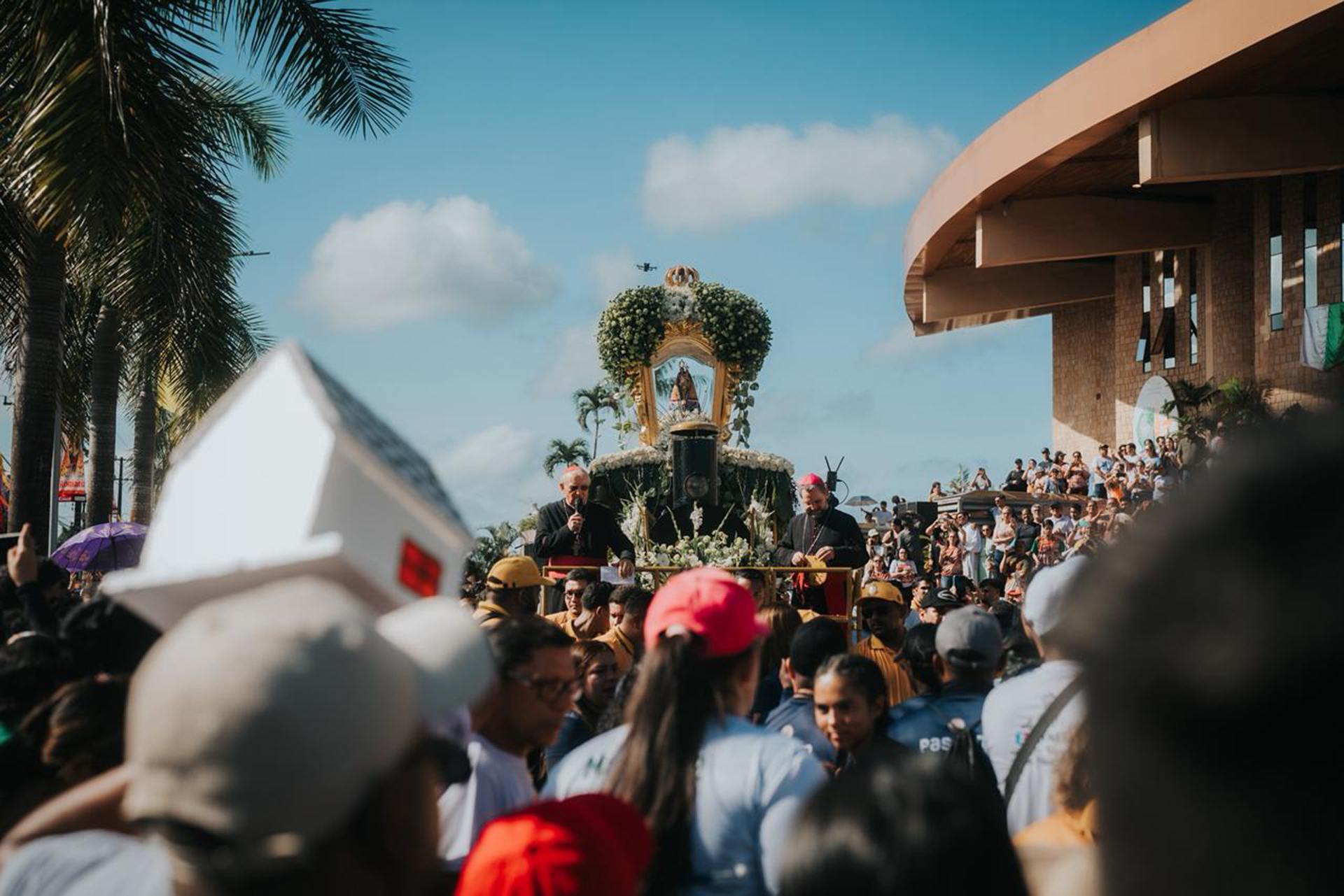 Isso acontecia após as celebrações festivas já realizadas no sábado: a carreata com o ícone da santa, percorrendo as nove paróquias da cidade; a missa campal na praça da Igreja de Sant’Ana, no Apeú; a procissão motorizada, que acompanhou a berlinda até a concha acústica da Praça São José, onde dom Carlos realizou a benção do novo manto e a imagem da Virgem de Nazaré foi revestida, sob os acordes da Banda 28 de janeiro, com canções marianas.