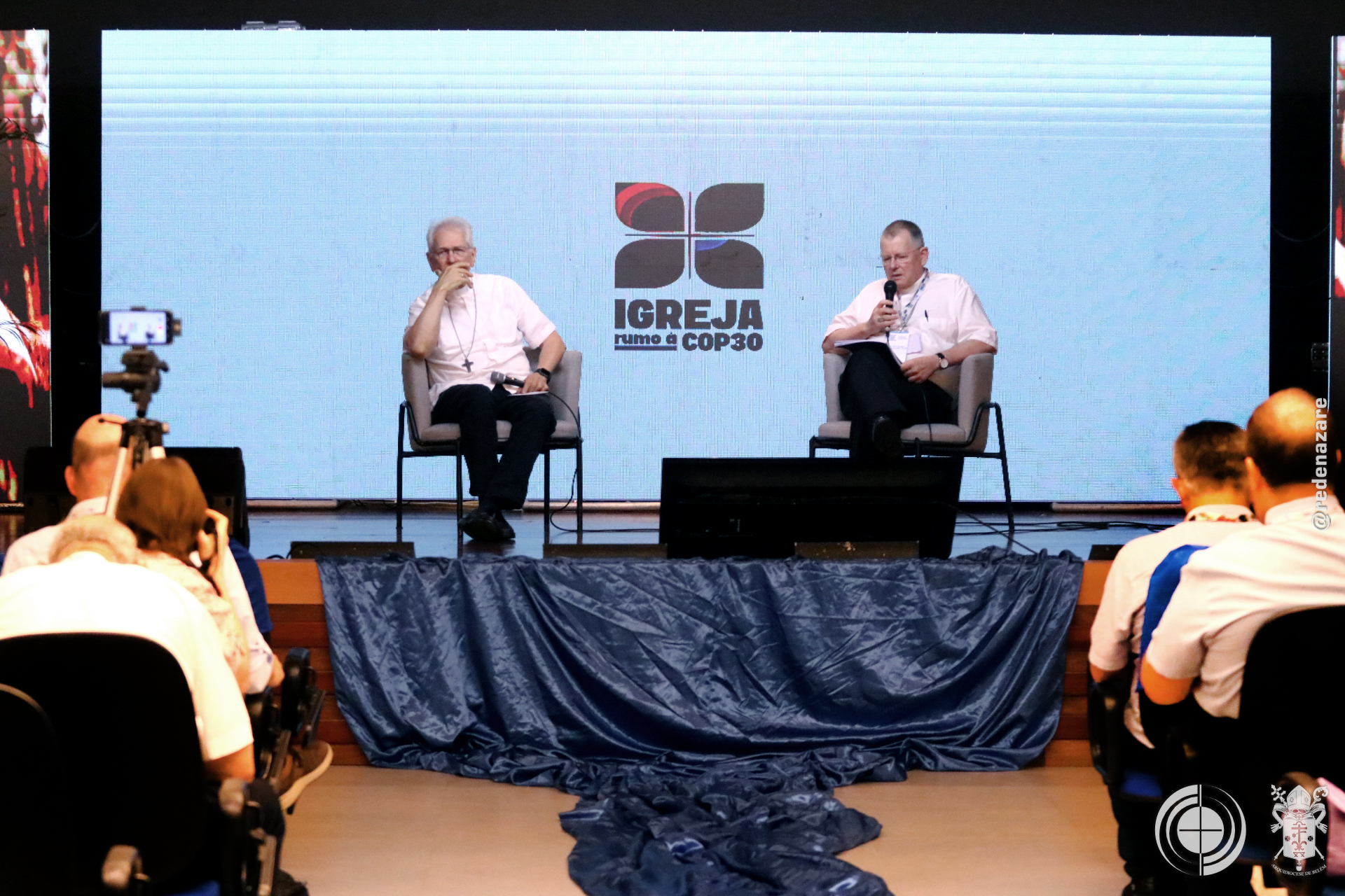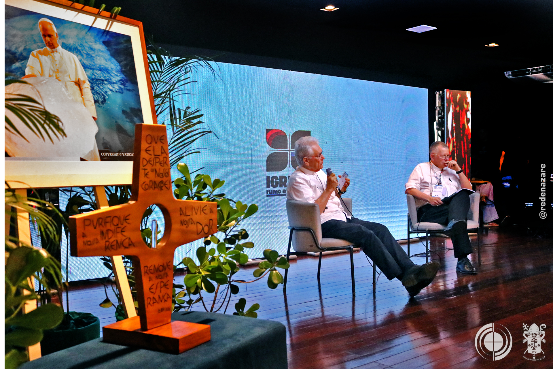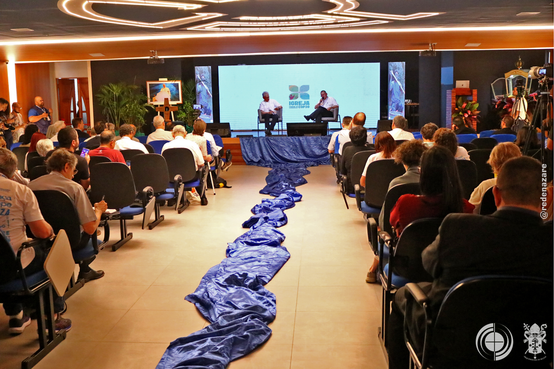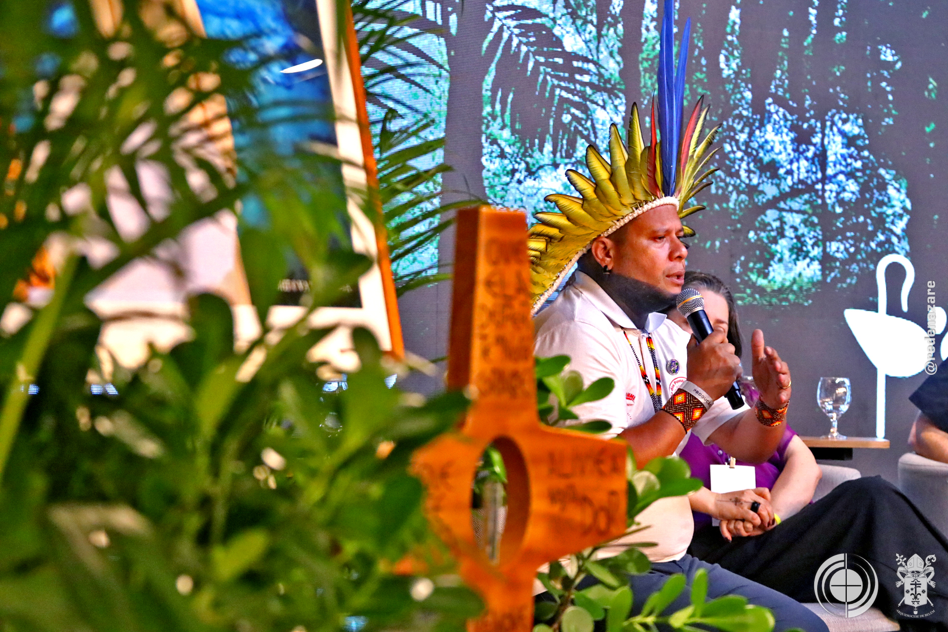 O simpósio não foi apenas um debate, mas um ato litúrgico e profético que era percebido não apenas nas explanações, mas na composição de todo o ambiente. No centro do palco, um tecido chamado “Rio da Esperança”, trazido pelo movimento LaudatoSí, de Roma. O tapete, simbolizou a unidade e a responsabilidade compartilhada sobre as águas. Ao lado, um ícone de madeira em formato de cruz continha água derretida de um bloco de gelo da Groenlândia, abençoada pelo Papa Francisco. A peça peregrinou por santuários brasileiros até a COP30. Estes objetos materializam a crise e a fé que move a ação.