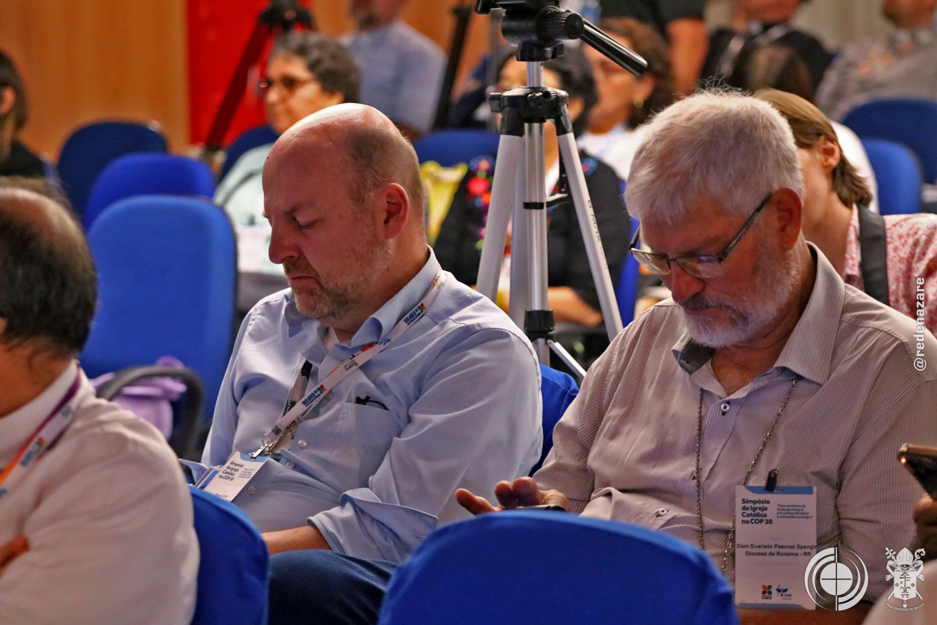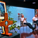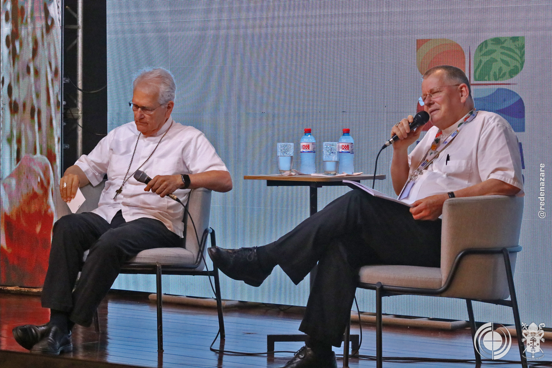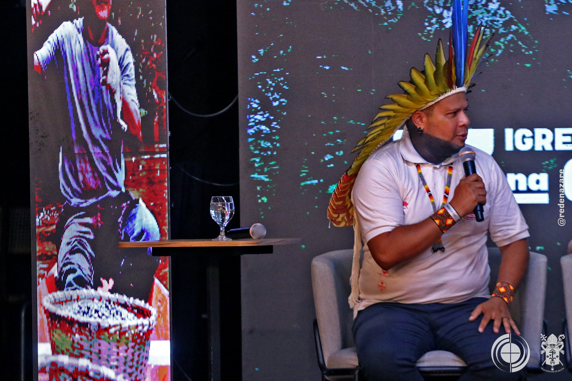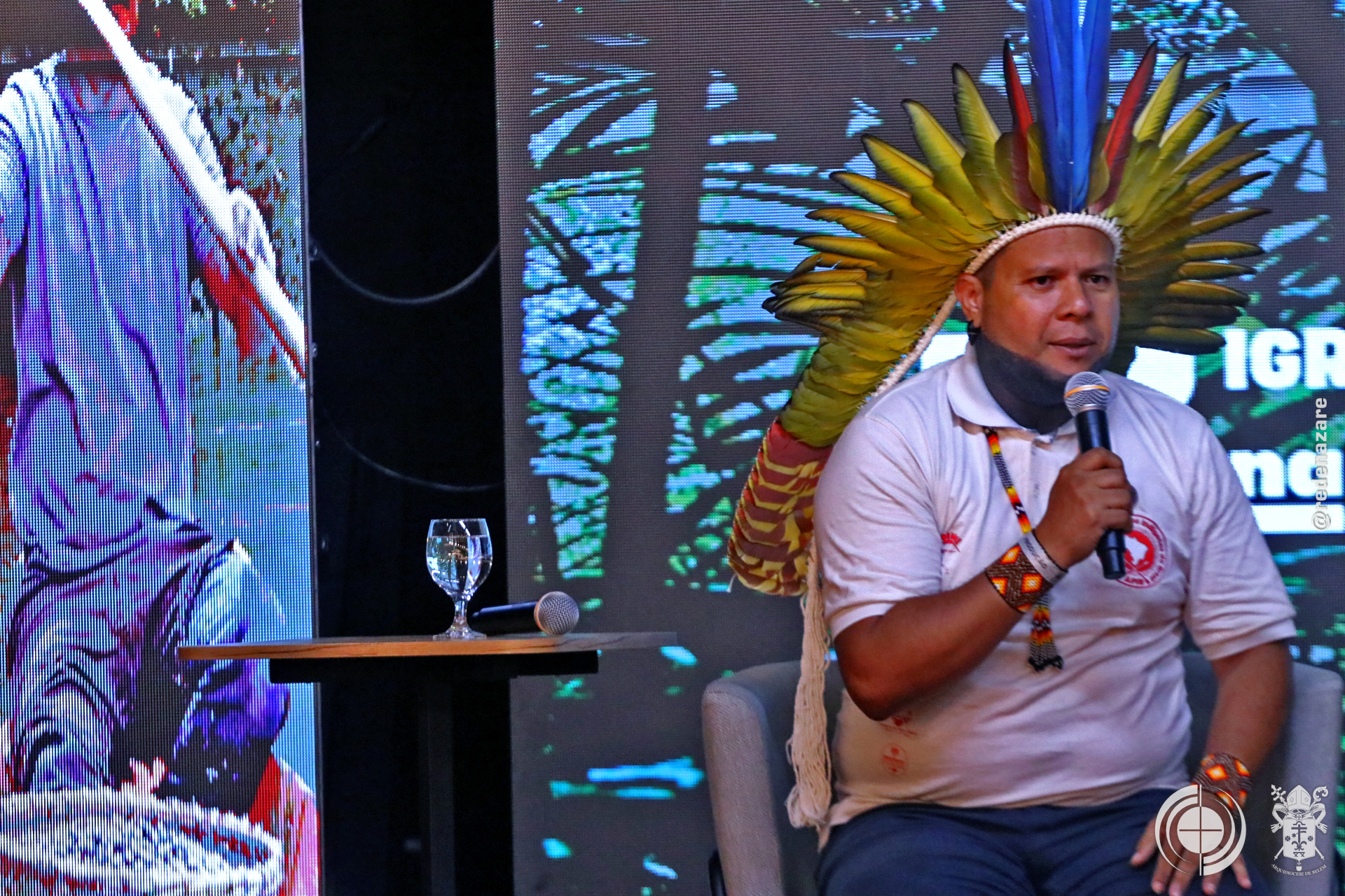 O simpósio não foi apenas um debate, mas um ato litúrgico e profético que era percebido não apenas nas explanações, mas na composição de todo o ambiente. No centro do palco, um tecido chamado “Rio da Esperança”, trazido pelo movimento LaudatoSí, de Roma. O tapete, simbolizou a unidade e a responsabilidade compartilhada sobre as águas. Ao lado, um ícone de madeira em formato de cruz continha água derretida de um bloco de gelo da Groenlândia, abençoada pelo Papa Francisco. A peça peregrinou por santuários brasileiros até a COP30. Estes objetos materializam a crise e a fé que move a ação.