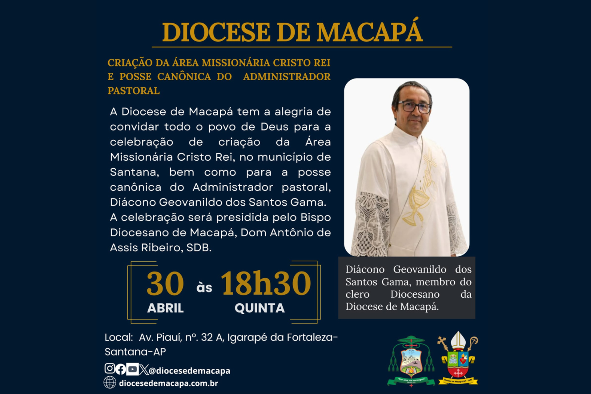 A Diocese de Macapá realiza, no próximo dia 30 de abril, a celebração de criação da Área Missionária Cristo Rei, no município de Santana no bairro Igarapé da Fortaleza. Juntamente com a missa de criação da Área acontece a posse canônica do primeiro Administrador Pastoral, o diácono permanente Geovanildo dos Santos Gama.