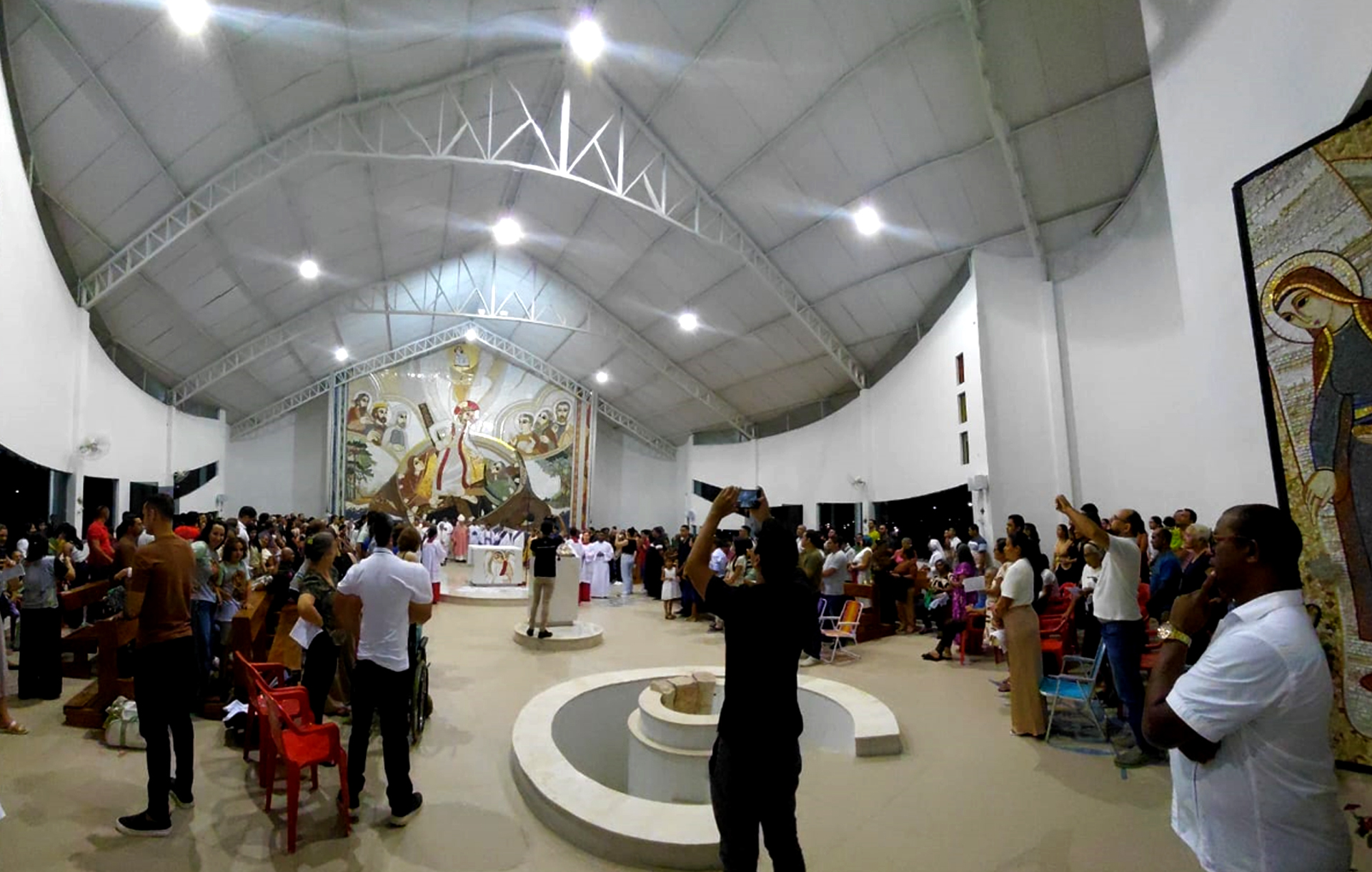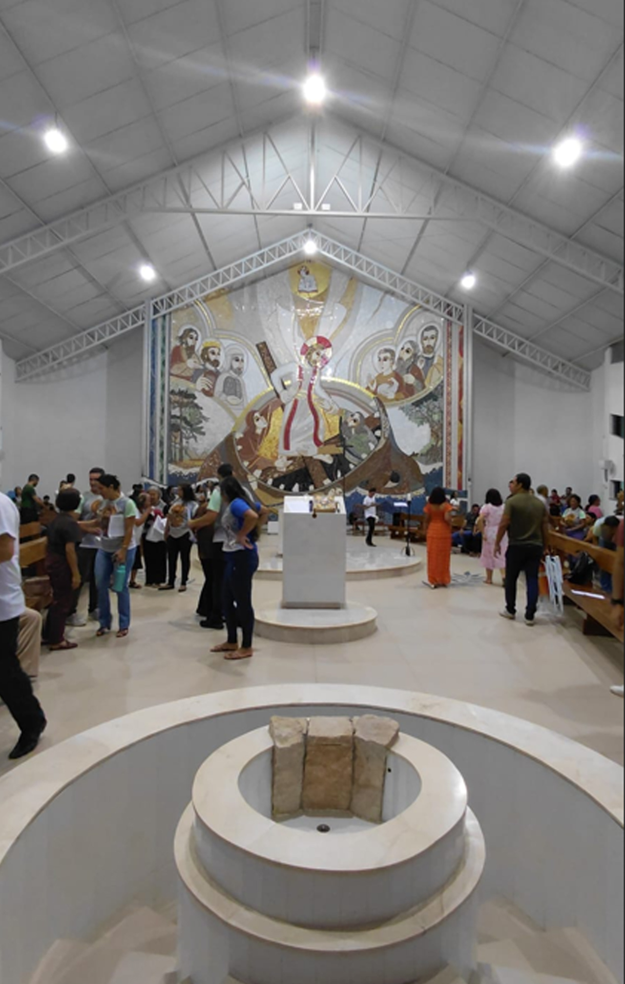 Além da disposição do espaço sagrado, uma obra de arte em mosaico, do AMACOM, recobre a abside. Nela está retratado Jesus Cristo que resgata Adão e Eva da boca do monstro, que é a morte. Uma grande Cruz, que é símbolo de Cristo, Salvador de todo homem, abre a boca do monstro. Figuras bíblicas dos santos resgatados, como Moisés, Davi, João Batista, estão a esquerda da Cruz e, a sua direita, estão Abel, Abraão e Barnabé.  No alto está o Cordeiro com o livro da Vida aberto, o Alfa e o Ômega; é o Cordeiro imolado, cujo sangue, derramado, ultrapassa todas as etapas do tempo, chegando em pequena artéria, até Jonas que está dormindo; ele, engolido pelo monstro, prefigura Cristo, que não permanece morto, mas vence a morte por todos nós.