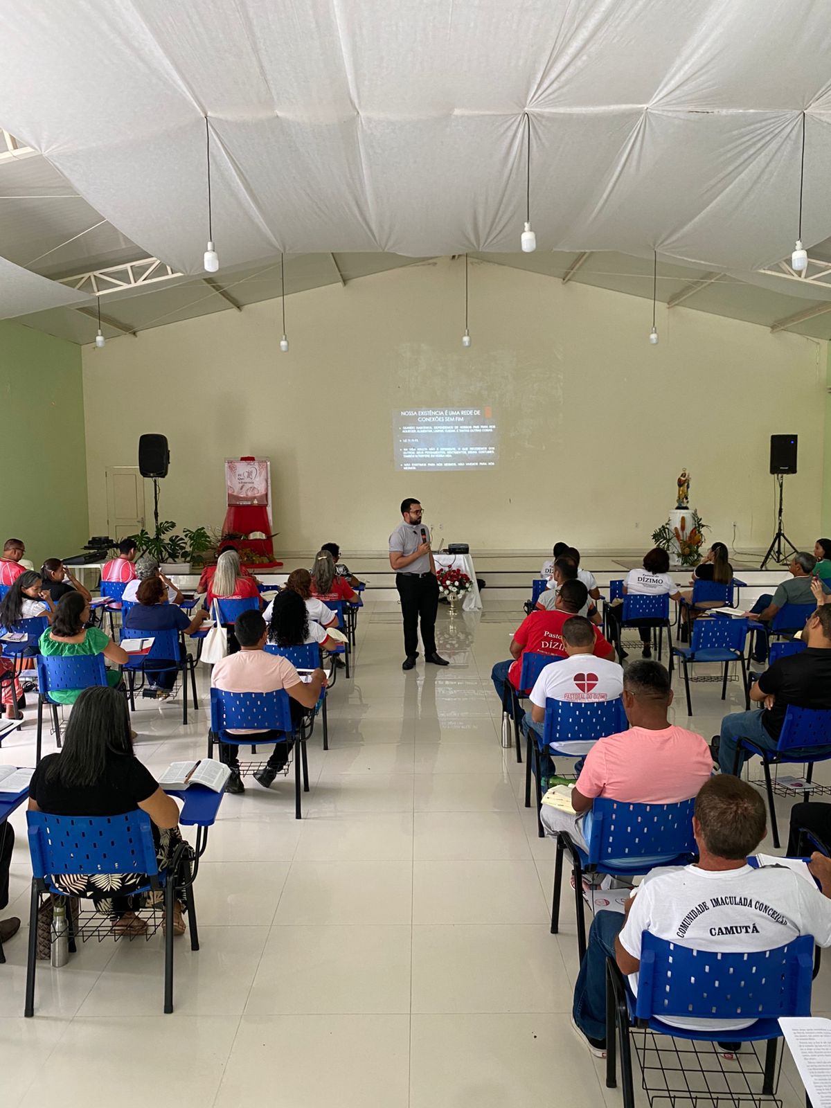 Ainda na primeira noite, os participantes visitaram os estandes e acompanharam a socialização dos resultados da Campanha “Partilhar muda tudo”, fortalecendo a comunhão e a troca de experiências entre as paróquias.