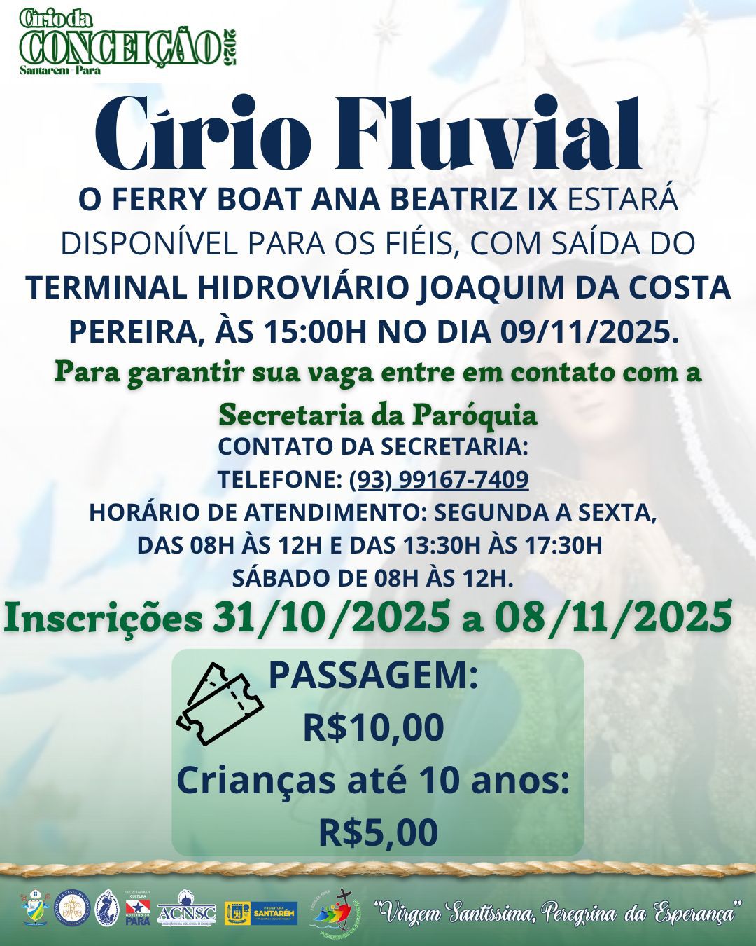 Os fiéis que desejarem participar do Círio Fluvial terão à disposição o ferry boat Ana Beatriz IX, que sairá às 15h do Terminal Hidroviário. As inscrições devem ser feitas até sábado, 8 de novembro, na Secretaria da Catedral, em horário comercial, ou pelo telefone (93) 99167-7409. Para este ano de 2025, será cobrada uma taxa de R$ 5,00 para crianças de até 10 anos, e de R$ 10,00 para participantes acima dessa faixa etária.