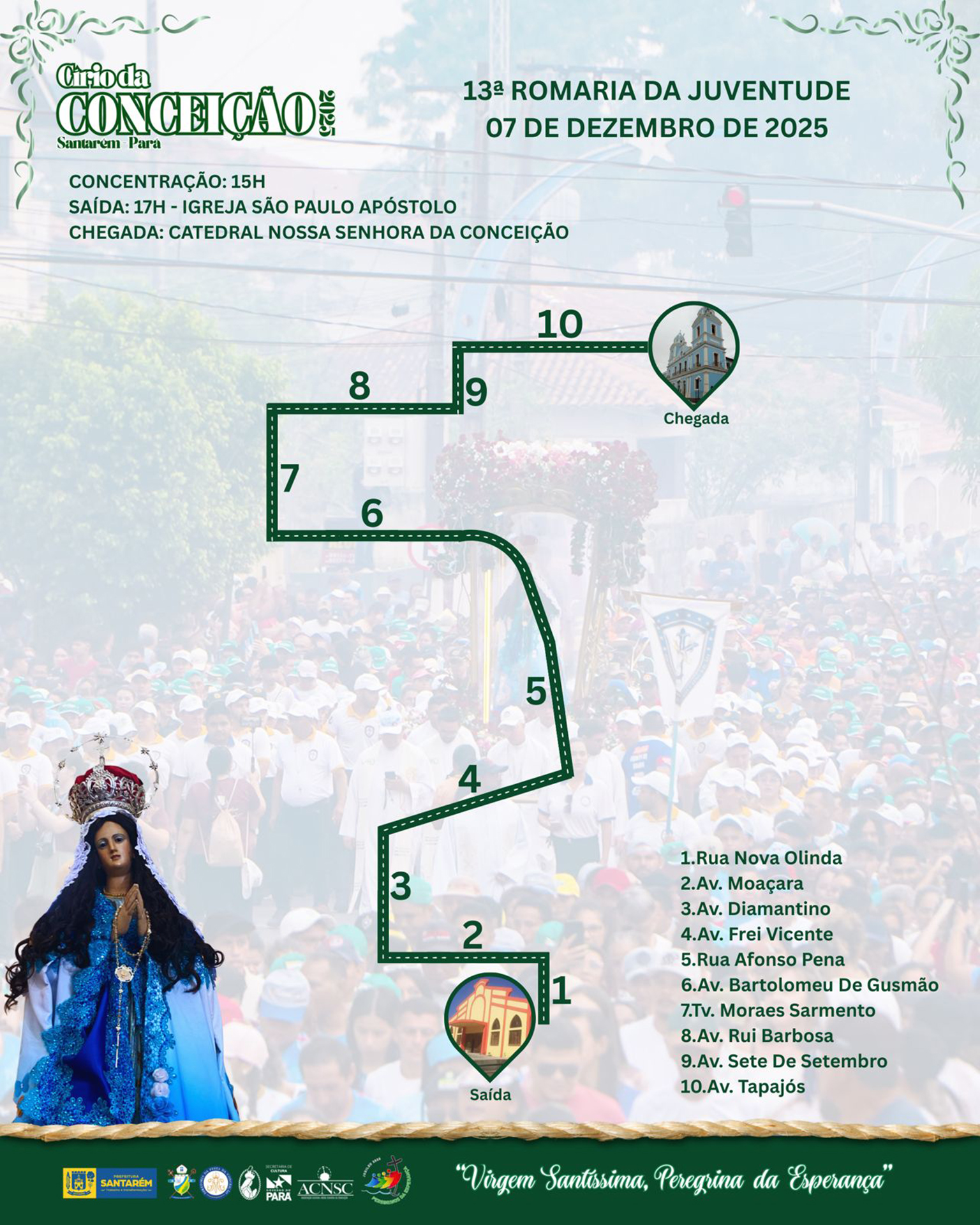 A saída da Romaria está prevista para as 17h, seguindo o percurso pela Rua Nova Olinda, Av. Moaçara, Av. Diamantino, Av. Frei Vicente, Rua Afonso Pena, Av. Bartolomeu de Gusmão, Trav. Moraes Sarmento, Av. Rui Barbosa, Av. Sete de Setembro e Av. Tapajós, com chegada no Elevado da Praça da Matriz.